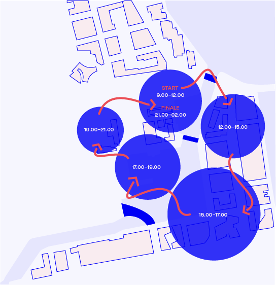 THE SUMMER BLOCK PARTY’S GEOGRAPHICAL FOCUS MOVES WITH THE SUN AROUND SÖDRA VARVSBASSÄNGEN. EACH LOCATION COMES ALIVE WITH ACTIVITIES IN ITS OWN TIME, BUILDING FROM EARLY MORNING INTO A SHARED NIGHT FINALE.